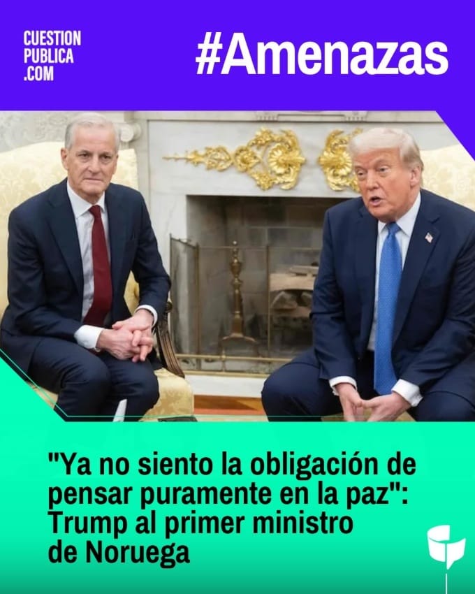 El presidente de Estados Unidos, Donald Trump, le dijo al primer ministro de Noruega, Jonas Gahr Støre, que ya no se sentía “obligado a pensar puramente en la paz”, luego de que el Comité Nobel noruego no le otorgara el Premio Nobel de la Paz. Cuestión Pública.